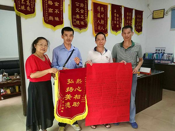 10月14日,陈伯两夫妻将一面写有“热心相助 弘扬美德”的锦旗,交到了江门市公共汽车有限公司驾驶员林宇光、施瑞堂的手中,感谢他们热心救助陈伯的义举。