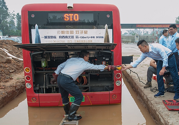 当应急救援指挥部总指挥收到事故情况报告后,立刻启动纯电车涉水应急预案。技术部、修理厂、综合部、纯电动公交车生产厂家同时开展救援工作,客车售后工程师利用检测工具对涉水车辆进行诊断,对检测数据进行分析判断,确定车辆检测正常后,驾驶员再将车辆启动驶离涉水区域。