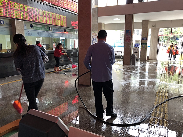 本次清洁行动重点针对本站的公共场所,团员志愿者们冲洗了售厅大厅、候车室、月台、发车卡位和停车场地面,清理站前广场和站场周边牛皮癣,铲除地面口香糖,并对售票厅和候车室天花板、门框、窗橱、售检票口、候车座椅等容易产生卫生死角的部位进行彻底清洁。在清洁行动,该站员工们不怕脏不怕累,用实际行动为旅客创造干净、整洁、文明的候、乘车环境,为恩平市创建文明城市添一份力。
