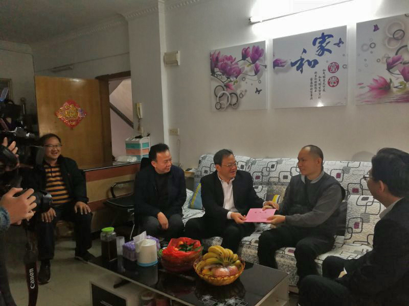 1月24日上午,江门市委副书记、市长刘毅,市委常委、组织部部长张元醒,市国资委党委书记、主任卢国壮以及集团公司党委书记、董事长吕俊杰、党委副书记、工会主席冯洁文一行上门慰问江门汽车总站困难职工陈志峰。