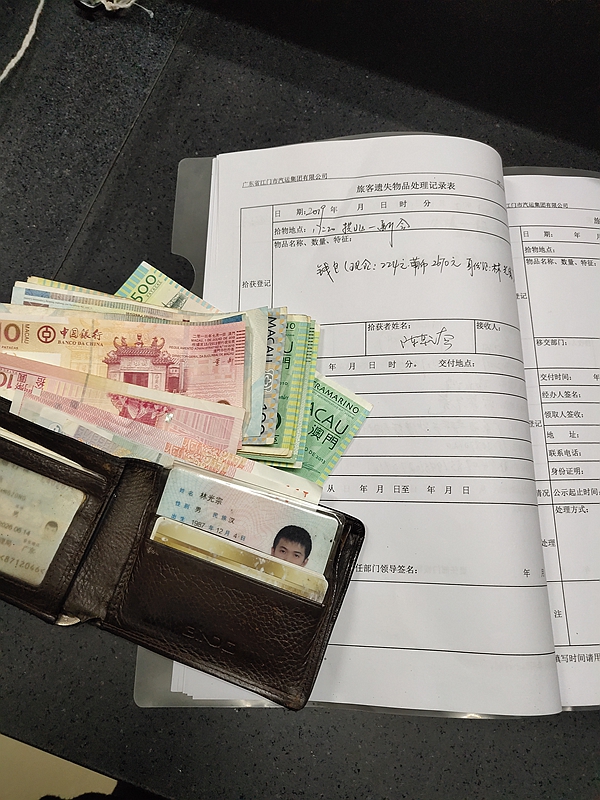 据了解,当天下午19时许,新会汽车总站驾驶员陈权套师傅到站清扫卫生时发现座椅上有一个钱包??悸堑铰每头⑾趾罂隙ɑ嵝募比绶伲率Ω盗⒖探坏轿恃洞Φ羌?。经清点,里面装有人民币224元、葡币2670元、身份证等。大约15分钟后,失主林先生前来问讯处找寻,当失而复得的钱包出现在眼前时,林先生都十分激动,连声说:“真是太感谢司机了!”