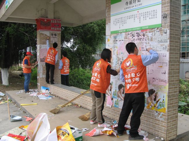 为积极响应开展学雷锋全民义工服务行动月活动的号召,3月21日早上,开平汽车总站组织义工开展“弘扬雷锋精神,共建幸??健蔽魈獾囊逦袂褰唷把Ю追妗被疃?,义务清洁开平市325国道沿线以及市区周边的农村客运候车亭,主要是清除候车亭内外的广告贴纸和清理候车亭周边的生活垃圾,为广大群众营造干净、舒适的候车环境。(谭俊杰 摄影报道)