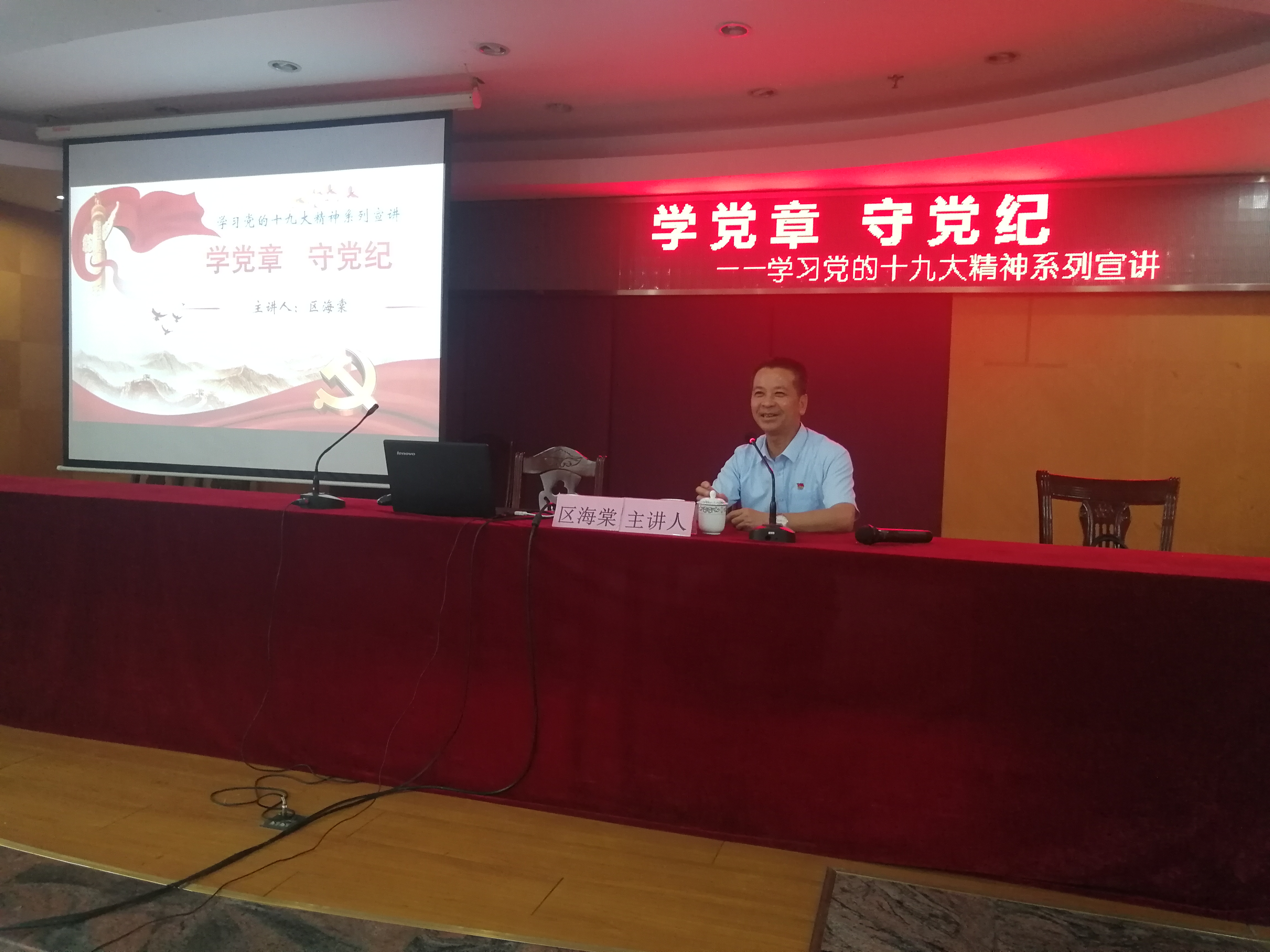 区海棠总经理主要从学党章、守党纪以及党给我们的启示等几个方面进行了阐述,党课引用了大量典型事例,课程形象生动,例证有力,党员们深受教育。区海棠同志在两个多小时的党课中,与大家一起回顾了从“中共一大”到“党的十九大”我党的光辉历程,通过对党史各个重要历史时期的重大决策和重大事件,深入分析和学习党史,加深全体干部党员对党的认识,进一步理解为什么中国共产党是中国特色社会主义事业和实现中华民族伟大复兴中国梦的领导核心,为什么全国各族人民必须高举中国特色社会主义旗帜,紧紧团结在中国共产党周围,万众一心地走向未来。