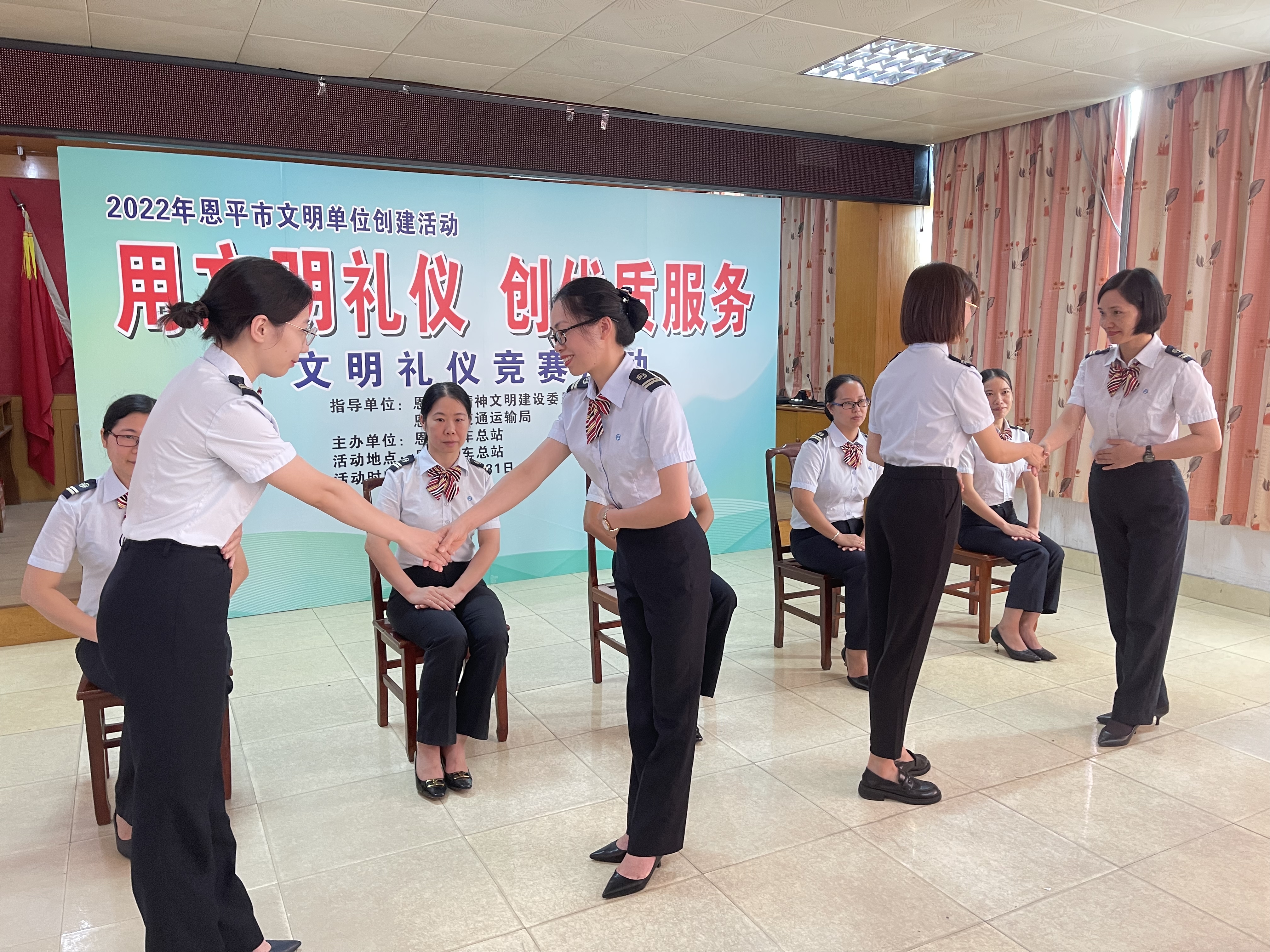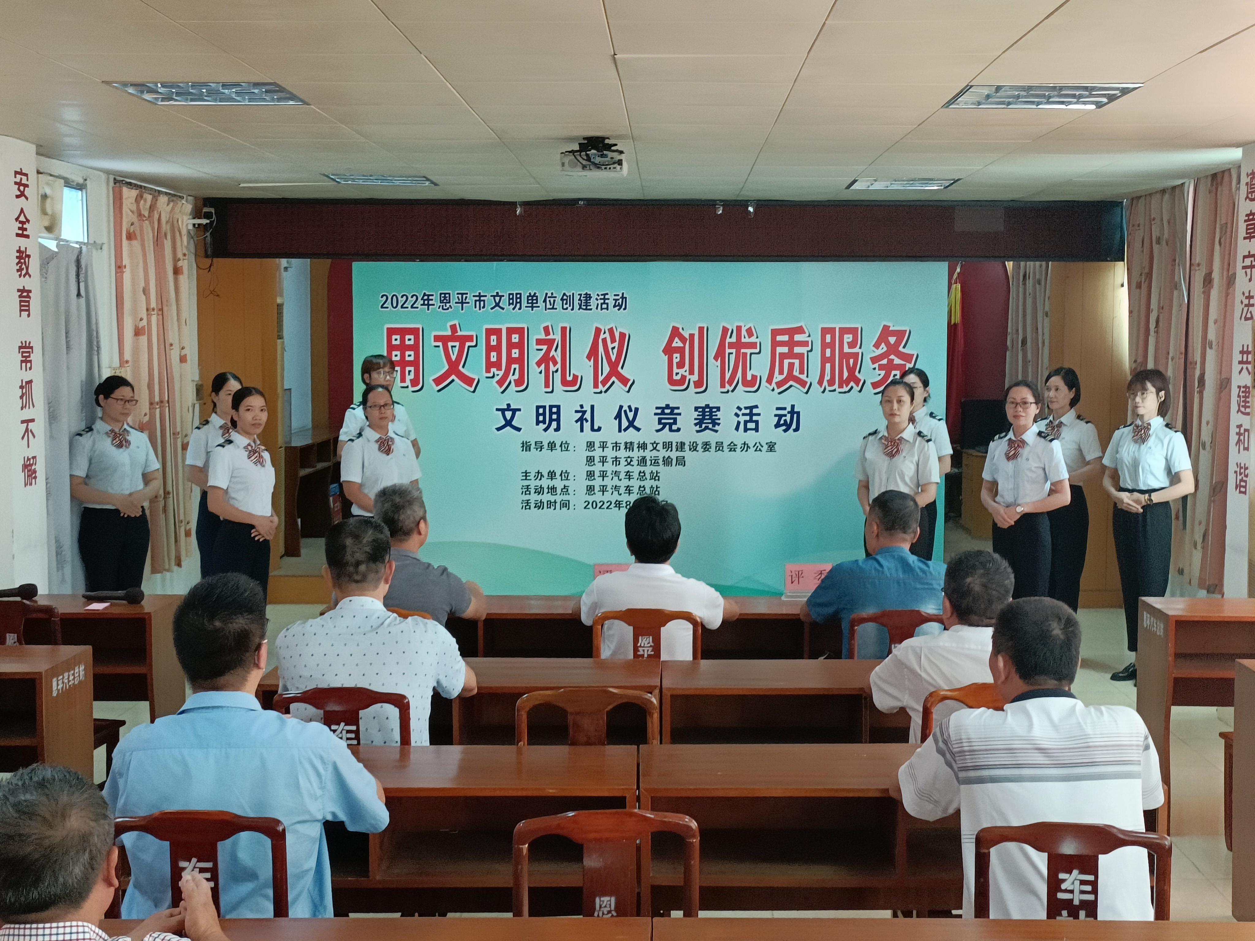 为深入推进恩平市文明城市创建工作,有效提升客运服务人员礼仪水平,塑造良好服务形象。近日,恩平汽车总站举办了一场“用文明礼仪 创优质服务”文明礼仪竞赛活动。来自该站各部门的10名一线站务人员参加竞赛。该站领导出席了此次活动。