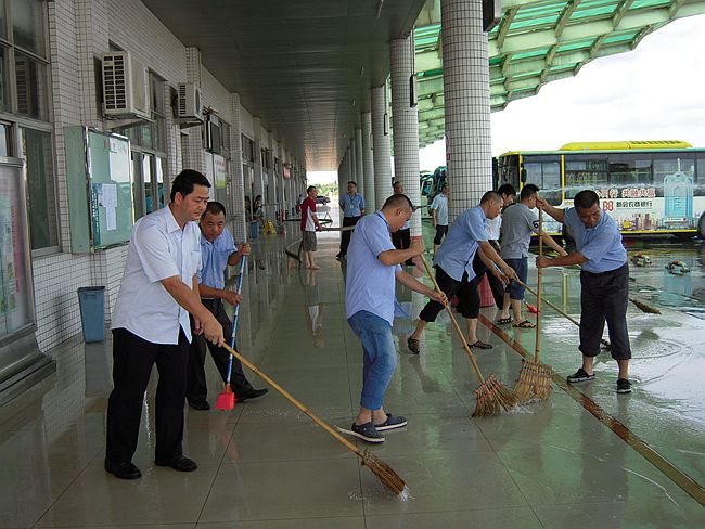 7月3日下午,在新会汽车总站发车月台见到了一班卷起裤脚,挽起衣袖的员工在埋头苦干地清洗发车月台和发车卡位。