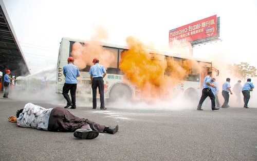 江门日报讯 (记者/郭永乐) 公交车司机欲检查一乘客的行李,该乘客却情绪失控,从行李包中取出一疑似燃油性胶罐,拿着打火机,扬言要烧车与整车人同归于尽。别紧张,这只不过是市公汽公司为提高应对突发事件的一次反恐应急演练,江海区消防大队、交警大队、治安大队,市五邑中医院、城轨江门站等单位参与了演练。