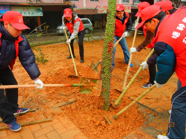 3月12日早上10时,机关团支部的义工们准时来到天沙河江嘴段的植树集合点,领到了锄头、铁铲等植树工具。在听取了组织单位的分工安排后,机关团支部的义工便紧张地投入到植树工作中,虽然一段时间以来的降雨使植树点的泥土变得又松软又潮湿,一有不慎可能会滑倒,但是机关支部的义工们还是当起了植树活动的“主力军”,除了把组织单位分给的栽种花卉的任务完成好,还积极主动的协助工作人员把附近的5棵3米多高大树栽种并固定好,机关支部的义工们有不少是第一次参加植树活动,虽然工作挺累也挺脏,但是大家都觉得能为我市的城市绿化工作做点贡献,尽自己的一分力非常有意义,并纷纷表示明年“3.12”还相约一起来参与活动,希望在不久的将来,通过大家的努力,能让家乡的天更蓝、山更青、地更绿、水更美?。ê挝案唬?BR>