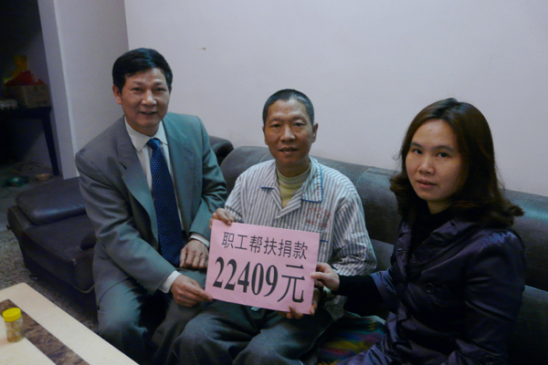 近日,江门汽车总站车队司机孙怀勇因患糖尿病综合症引发各种疾病,导致行动不便,要长期住院接受治疗,他本人无法支付较大的医疗费用。为此,总站党、政、工、团、妇联合发出倡议,号召广大职工献出爱心,帮助有实际困难的同事。职工们纷纷响应,立即行动起来,霎时间,一股传递爱心温暖你我的“爱心潮流”在总站漫延。本次共募集到捐款22409元。工会主席杨德培、副主席翁小玲等人亲自上门慰问,并将职工帮扶捐款亲手交给孙怀勇,以解决燃眉之急。孙怀勇十分感谢总站各级领导、职工和同事,表示尽快调养好身体重返岗位。(区丽娟 摄影报道)